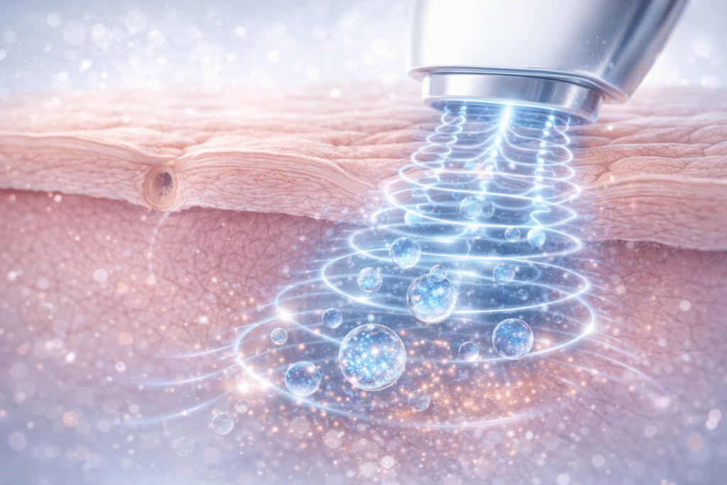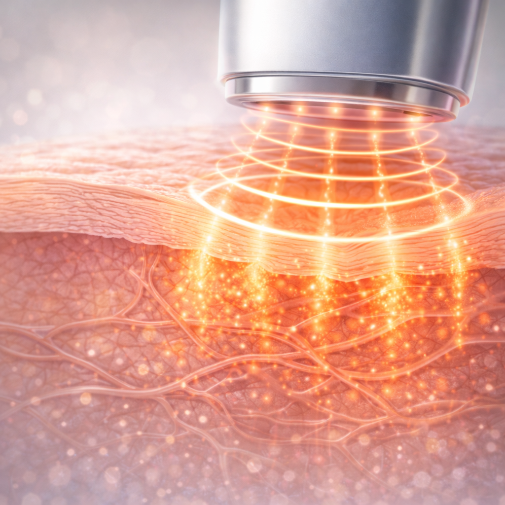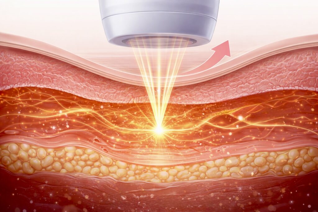 Az intenzív ultrahangenergia (hőenergia) képes behatolni a bőr irha rétegébe. Fókuszált hőenergia hatására új kollagéntermelést eredményez, beindítja a bőr önregenerációs folyamatait. Ez a kezelés természetes eljárás, nem invazív módon fejti ki a hatását.